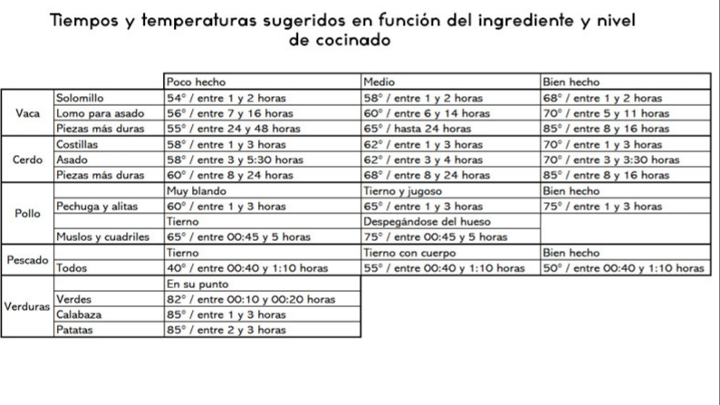 Os dejo con una tabla orientativa de temperaturas y tiempos.