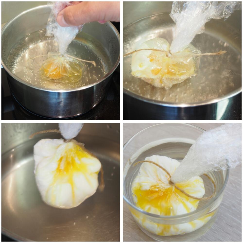 Colocamos 2 litros de agua con 200 ml de vinagre en una olla. Llevamos a hervor, sacamos y removemos para que tenga efecto de centrifugado, momento en que añadimos el huevo para que se haga con el calor residual el líquido. Hay un truco que ayuda a que no se nos rompa el huevo en el agua, para ello con papel film hacemos un saquito con el huevo y metemos en el agua. Abajo tenéis las dos opciones.