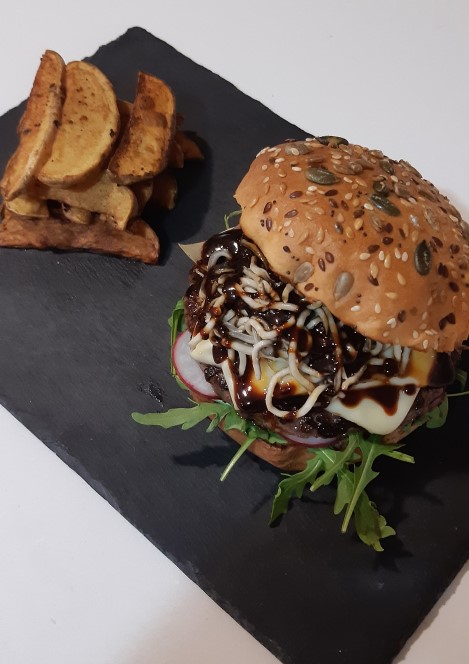 Y aquí la receta que he elegido para realizar una gran hamburguesa gourmet, tal y como nos pidieron que hiciéramos con su hamburguesa de ternera con reducción de Pedro Ximenez-nueces y el Panecillo brioche de doble fermentación con semillas.