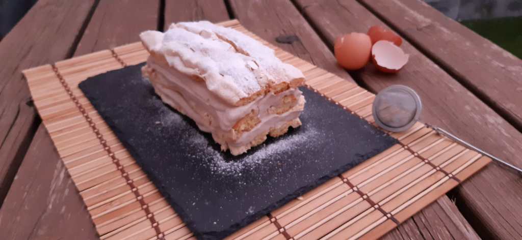 Finalmente cuando saques la masa del horno empieza el proceso de montaje. Por un lado toma la nata con el azúcar y por otro toma las tres capas de masa con merengue que acabas de sacar. Aplica el relleno entre capas.