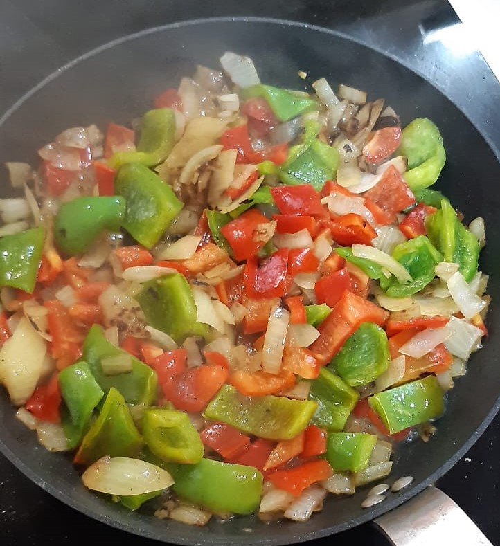Mientras, vamos cortando las verduras y sofreímos en otra sartén.
