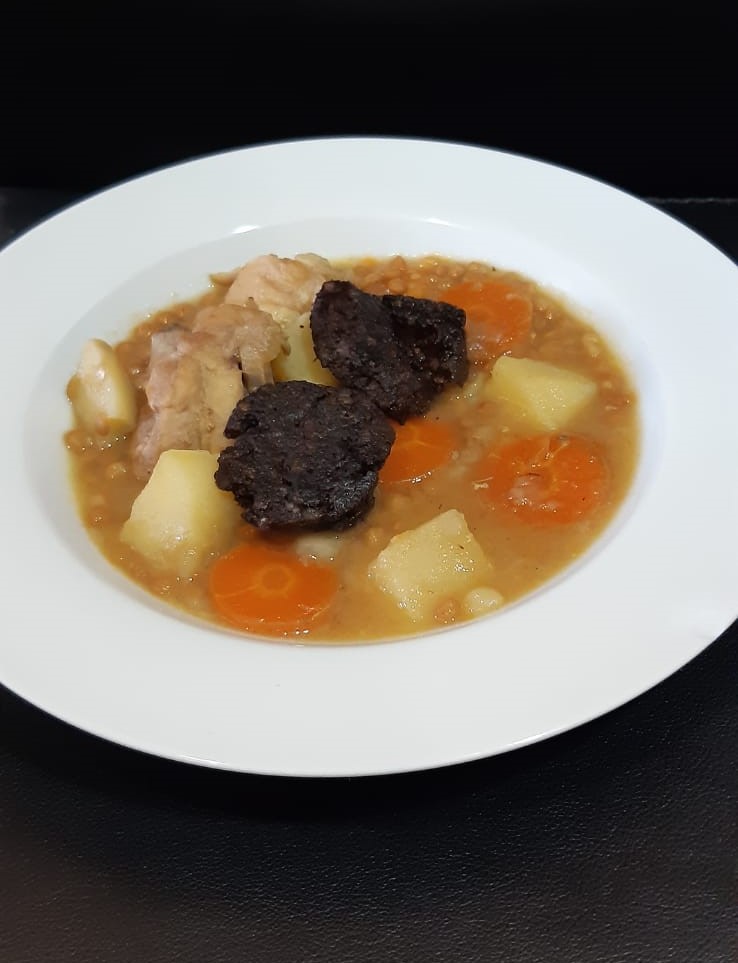 Picamos la cebolla, cortamos la zanahoria en rodajas final y sofreímos. Añadimos el pollo, doramos un poco, añadimos el tomate triturado y removemos. Pelamos y cortamos las patatas en dados, añadimos a la olla, junto con el laurel, la sal, la pastilla de caldo y el agua hasta que se cubran las patatas. Cerramos la olla exprés y dejamos cocer 10 minutos. Después abrimos, añadimos el bote de lentejas, removemos, y dejamos cocer de nuevo esta vez abierto unos 5 minutos. El chorizo o la morcilla a mi me gusta hacerlo aparte pero se puede añadir cuando queráis. En este caso pase por la sartén la morcilla en rodajas, luego las añadí al plato.