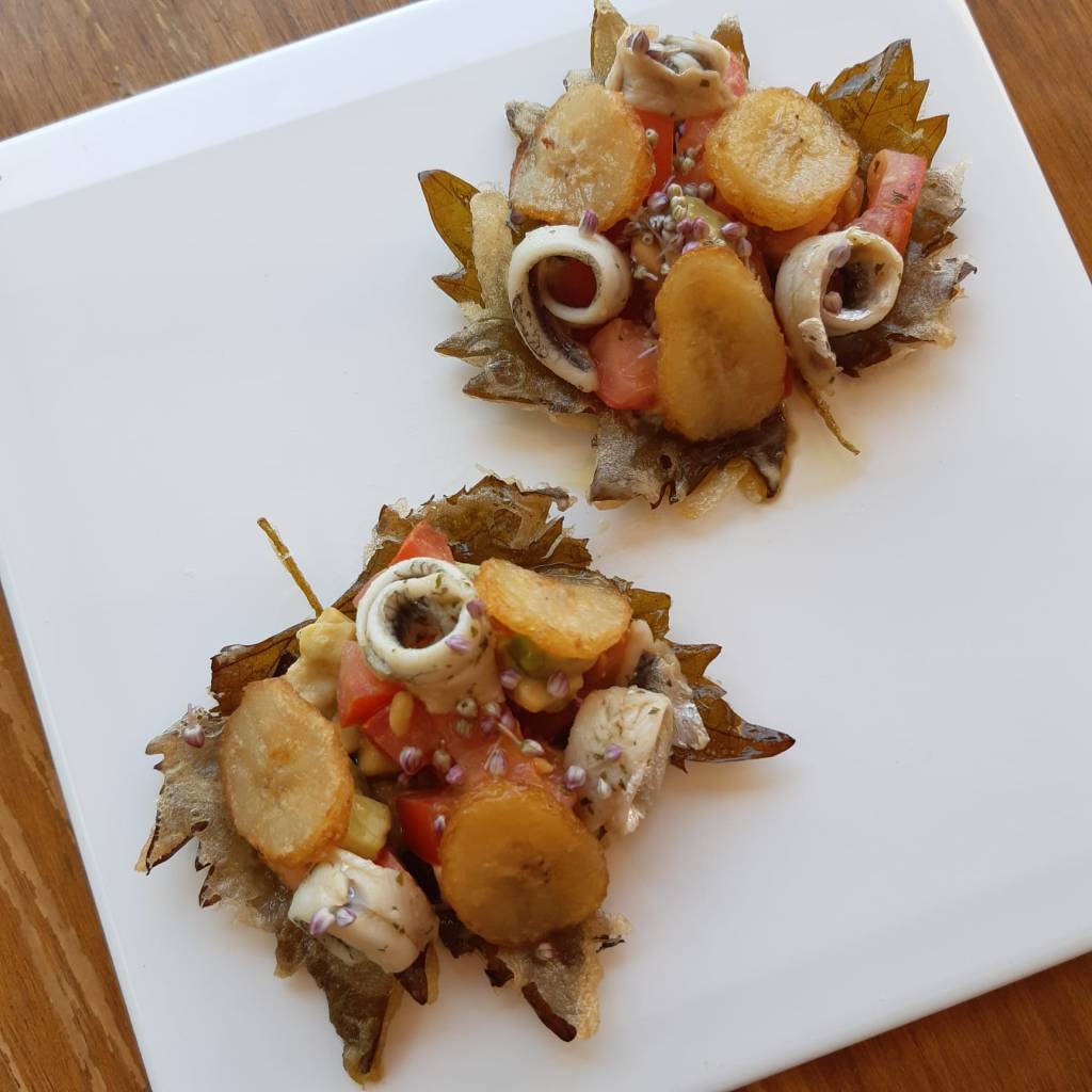 Colocamos las hojas en el plato, encima pondremos la ensalada de tomate y aguacate, acompañaremos con rodajas de plátano frito y los boquerones enrollados.