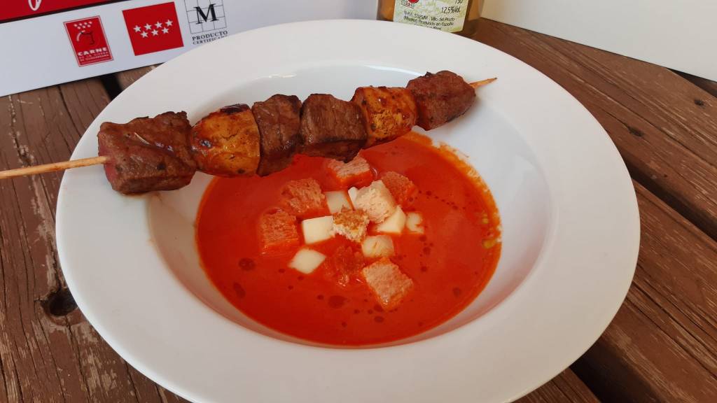 Para el emplatado, pon en un plato hondo la sopa fría, decora con el pan y el queso y coloca la brocheta de lado a lado del plato, sujeta en los bordes.