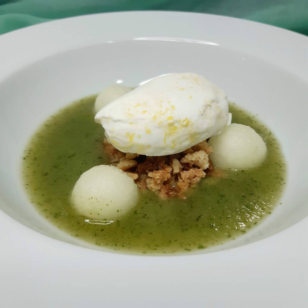 No dejara indiferente a nadie, entre la frescura del melón y la hierbabuena, el crujiente y dulce crumble y el helado del limón coronando el plato, hacen de este postre un postre redondo y perfecto para cualquier comida.
