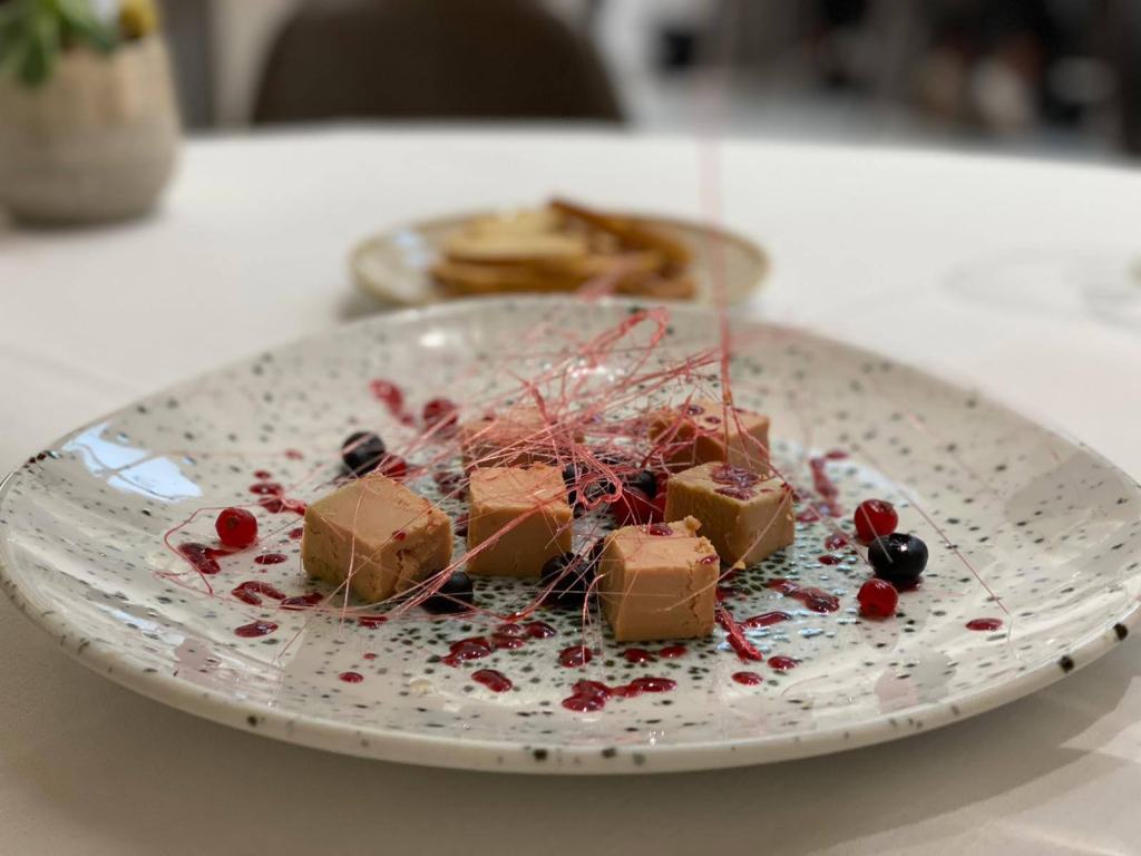 El menú empieza con un aperitivo para compartir, en este caso un Mousse de Foie Micuit con Culis de frutos rojos, frutos rojos y caramelo isomalt.