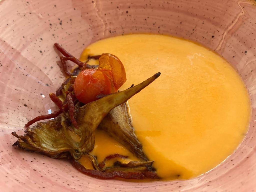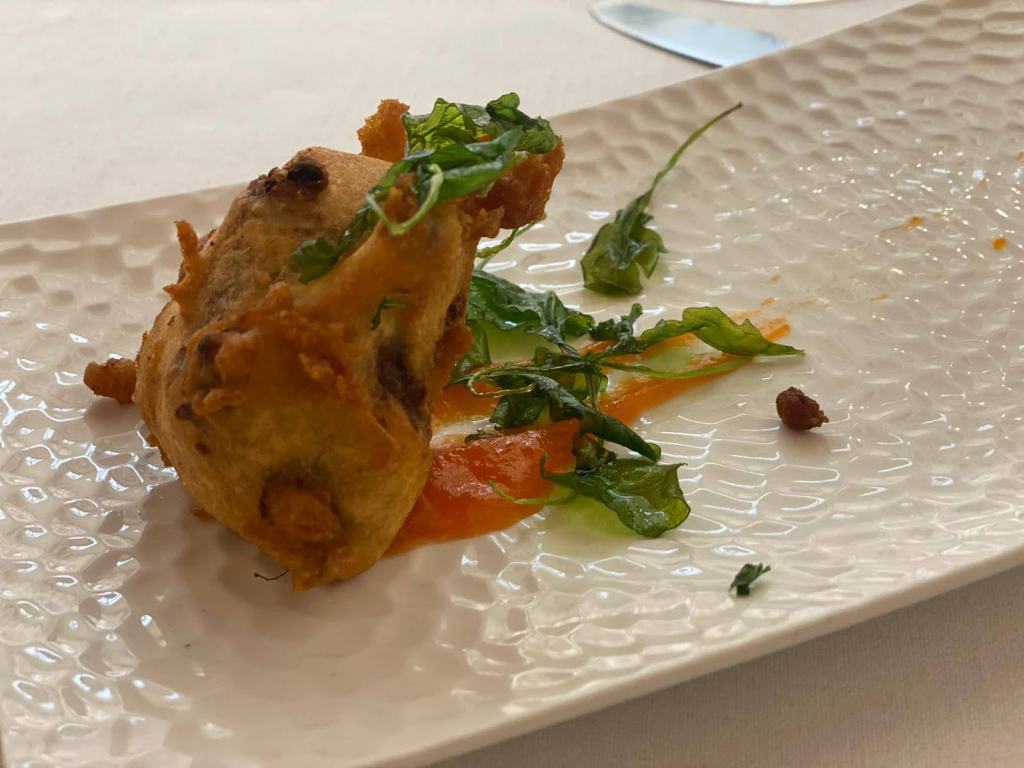 Después tendríamos dos entrantes, el primero era Alcachofa frita, crujiente de jamón y salmorejo.