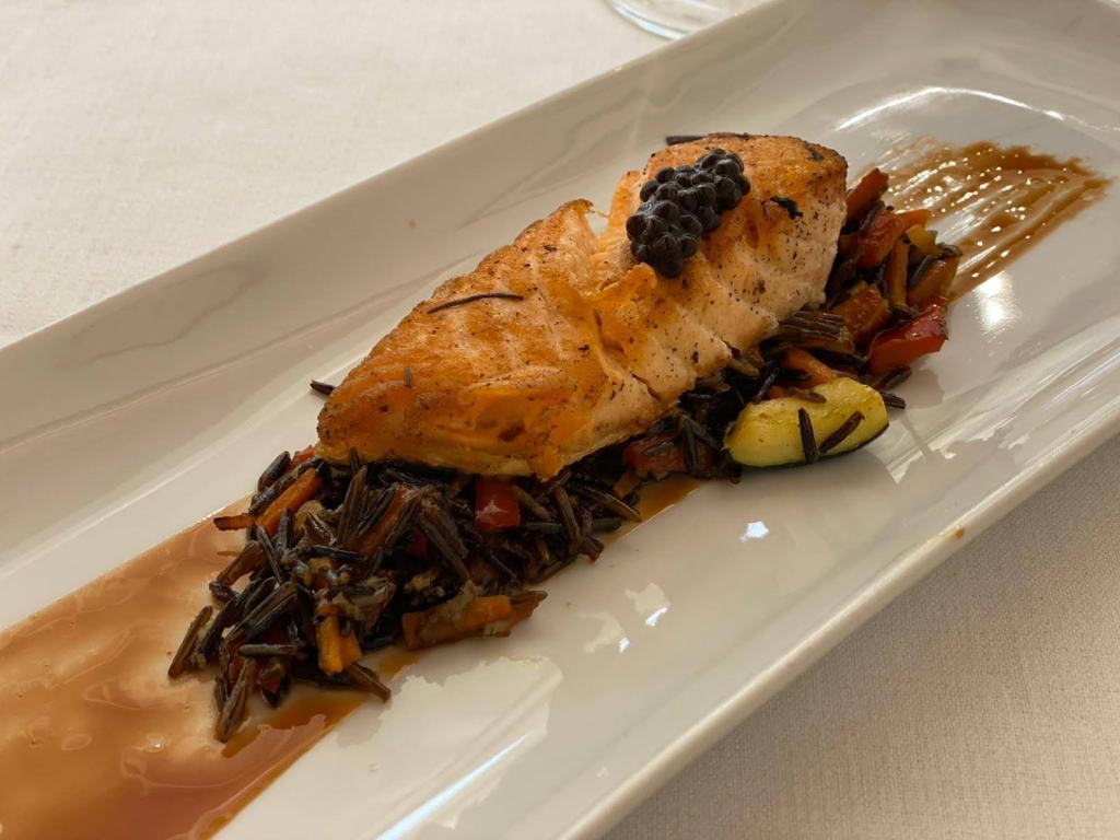Y empezamos con los principales donde tuvimos pescado y carne, lo que tienen en común ambos platos es que son los que menos nos sorprendieron del menú, por su sencillez o sabores mas conocidos para nosotros. Primero nos sirvieron el Pescado, Salmon al horno con wok de arroz tailandés.