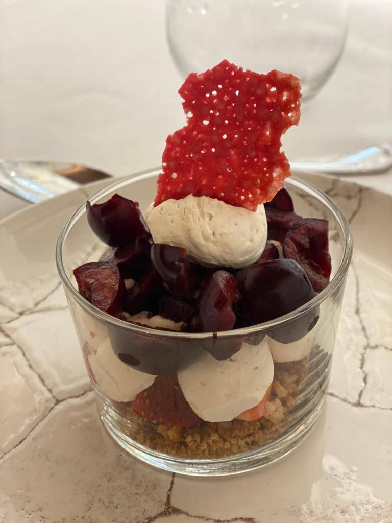 Llegó el final del menú con el postre, Chantilly con cerezas y fresas.