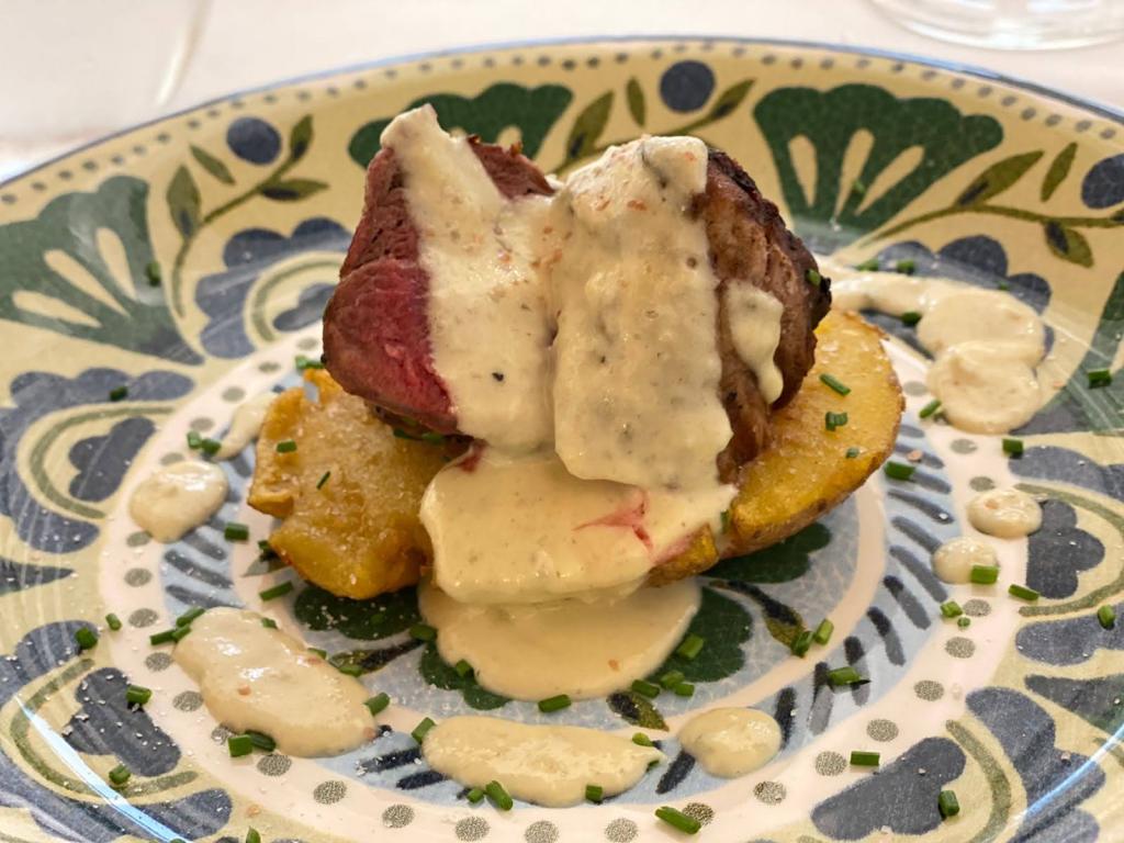 Nuevamente un plato acertado, aunque muy conocido en nuestra gastronomía, me encanta el roquefort y disfrute mucho cada bocado. Como podéis ver el punto de la carne estaba perfecto, la salsa estaba exquisita y le acompañaba media patata con una textura y sabor maravilloso.
